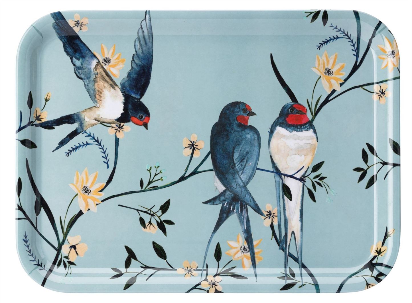 This Large Gloss Finish Rectangular Tray is a practical, essential item with a wipe clean finish for easy cleaning. Ideal for transporting food and tableware or used as a lap tray for informal occasions. The tray features distinctive swallow illustrations set within a stylish floral design. Co-ordinating items are available.