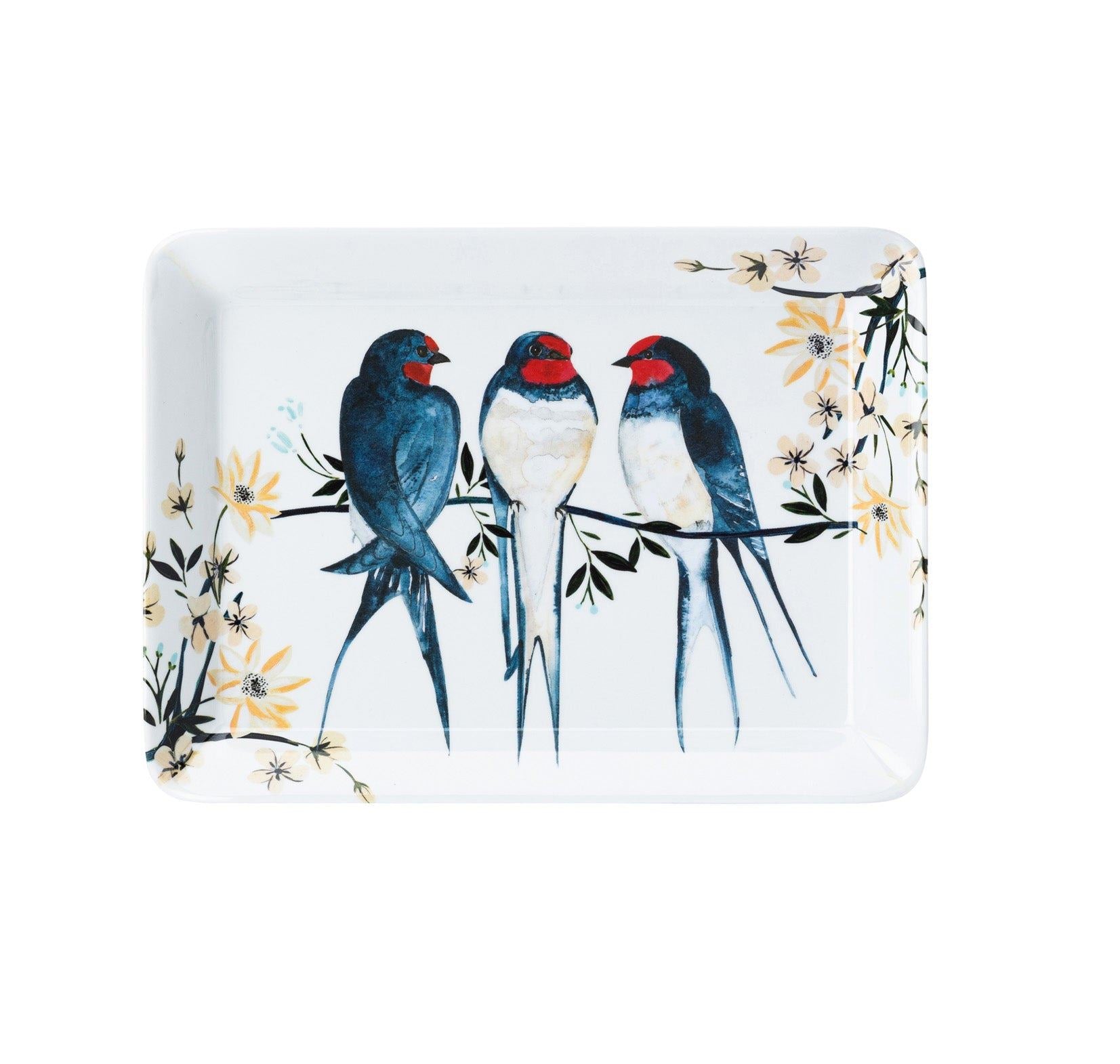 This scatter tray makes the perfect way to carry your mug/s and treats together, making this a stylish and practical addition to your home. The melamine makes for an easy clean that can be used over and over. Featuring distinctive swallow illustrations set within a stylish floral design. Co-ordinating items are available.